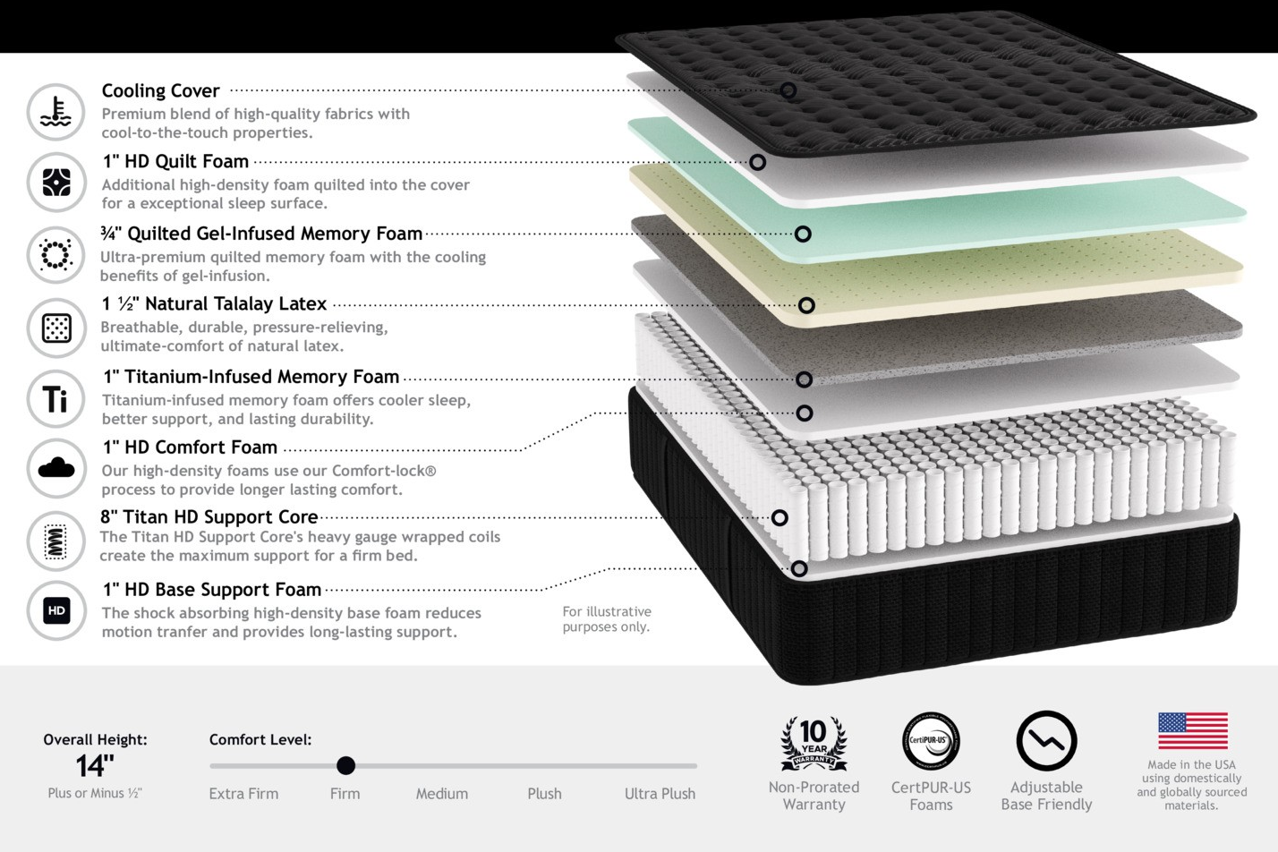 Experience refined comfort with the Allegiance Medium mattress, designed to provide balanced support through its 14" thickness and Titan HD Support Core. Combining titanium-infused memory foam, natural latex, and quilted gel-infused memory foam, it delivers gentle pressure relief while maintaining a medium firmness. The breathable cooling cover promotes a fresh sleep environment. Made in the USA and CertiPUR-US certified, this durable mattress includes a 10-year warranty and works seamlessly with adjustable bases for tailored comfort. Elevate your rest with this expertly crafted mattress blending advanced materials and elegant design.