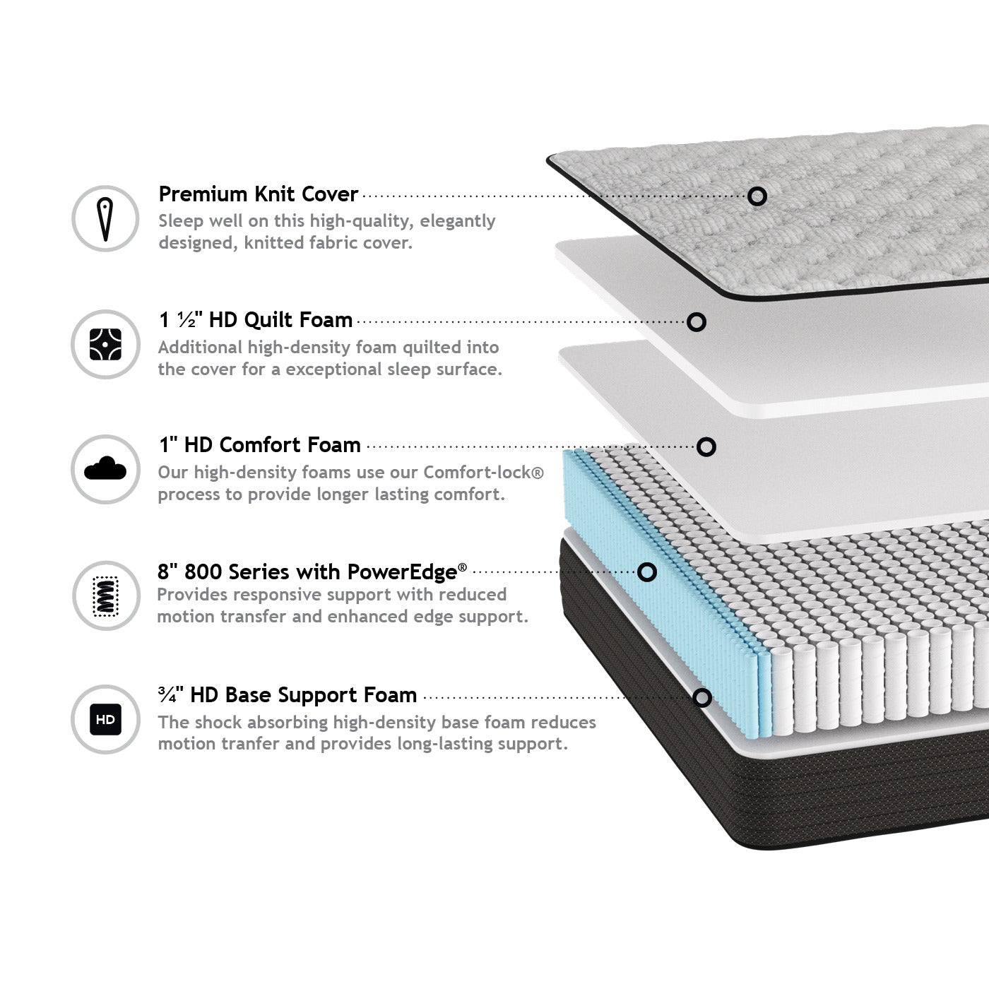 Drift off in style on the 11-inch Frontier Medium mattress, built to keep you comfy and supported all night long. Wrapped in a soft premium knit cover with cozy layers of high-density quilt and comfort foam, it strikes the perfect medium balance. The 800 Series wrapped coil system with Power Edge Technology means durability and edge support that won’t quit. Made in the USA and ready for adjustable bases, it’s packed with CertPUR-US certified foams and backed by a 10-year full warranty—sweet dreams guaranteed!