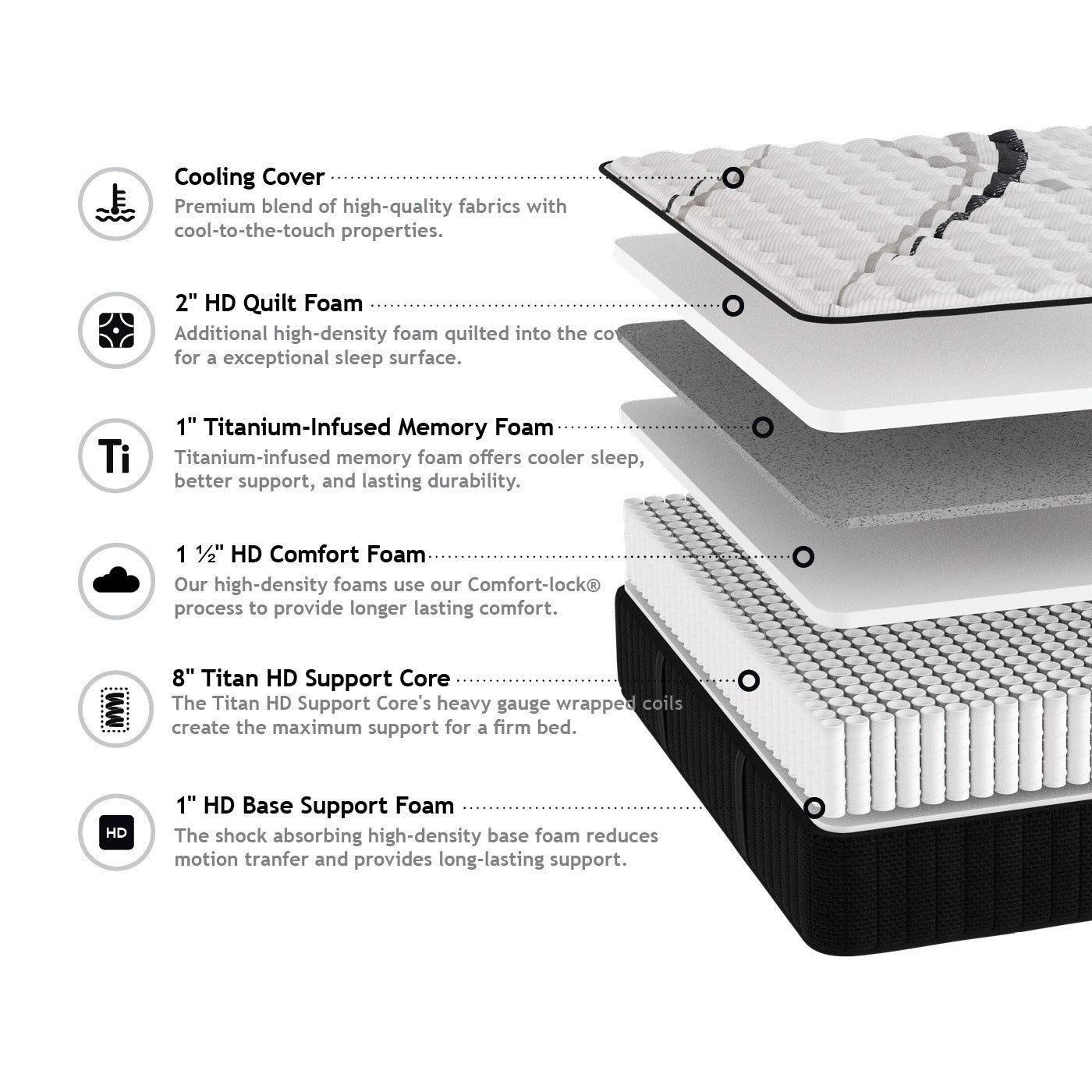 Experience unparalleled support with the Liberty Firm mattress. The robust 13.5" profile features a Titan HD Support Core with heavy gauge wrapped coils, complemented by titanium-infused memory foam that regulates temperature while providing exceptional support. HD Quilt Foam creates a refined sleep surface, while CertiPUR-US certified foams ensure peace of mind. Designed for compatibility with adjustable beds and backed by a comprehensive 10-year warranty, this sophisticated sleep solution delivers enduring comfort and stability. Also, available in specialized R.V. dimensions for discerning travelers.
