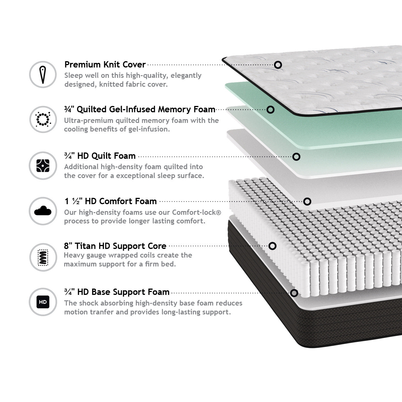 Elevate your sleep experience with the Freedom Extra Firm mattress, boasting an impressive 11 1/2-inch thickness. This masterpiece features a luxurious premium knit cover enveloping quilted, gel-infused memory foam and high-density comfort foam, all supported by the formidable Titan HD Support Core which consists of edge to edge pocketed coils. Crafted with exceptional precision in the USA, it promises enduring quality backed by a 10-year warranty. Fully compatible with adjustable bases, this mattress delivers supreme firmness and unparalleled support for those who demand the very best in restorative rest.